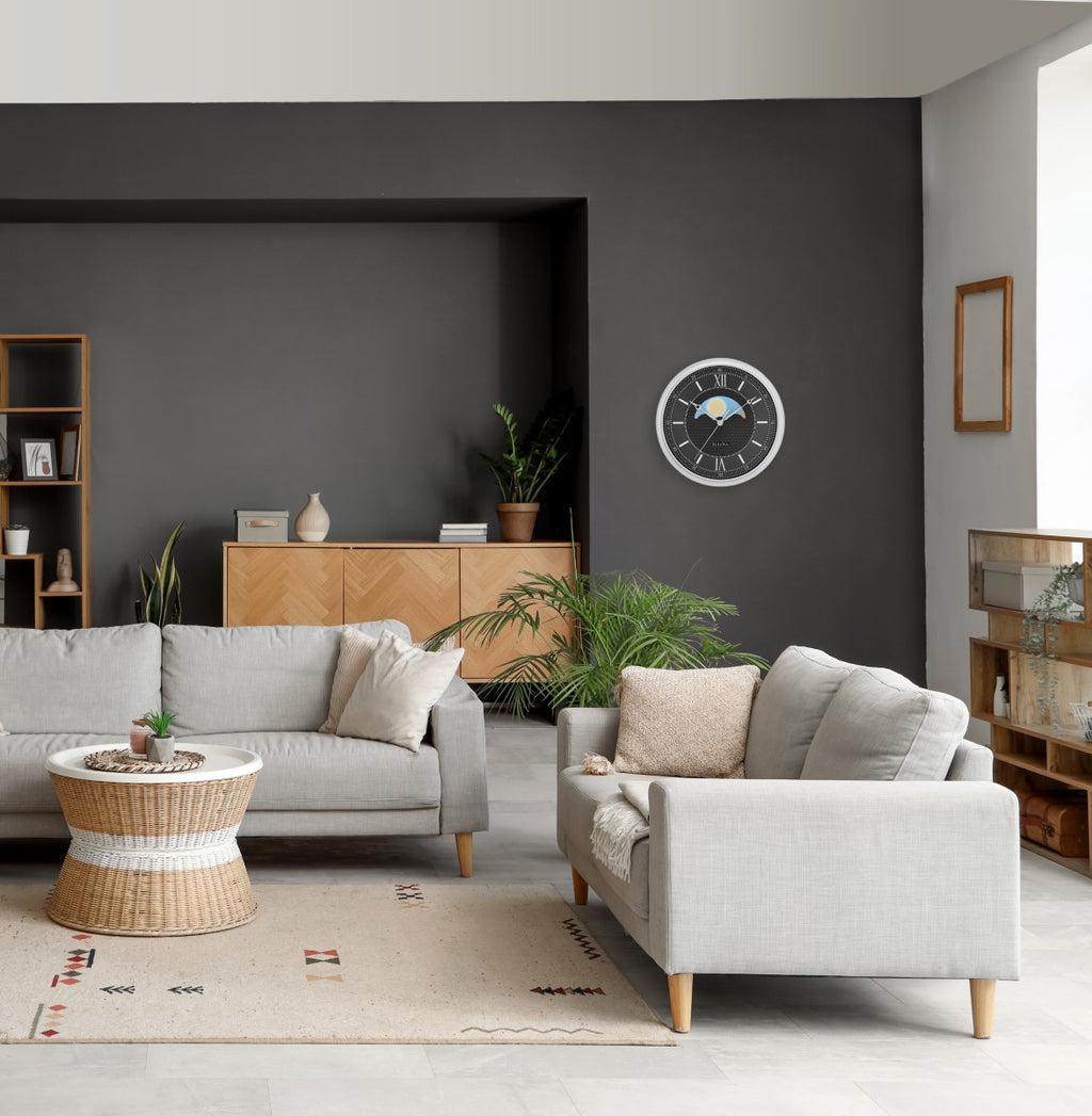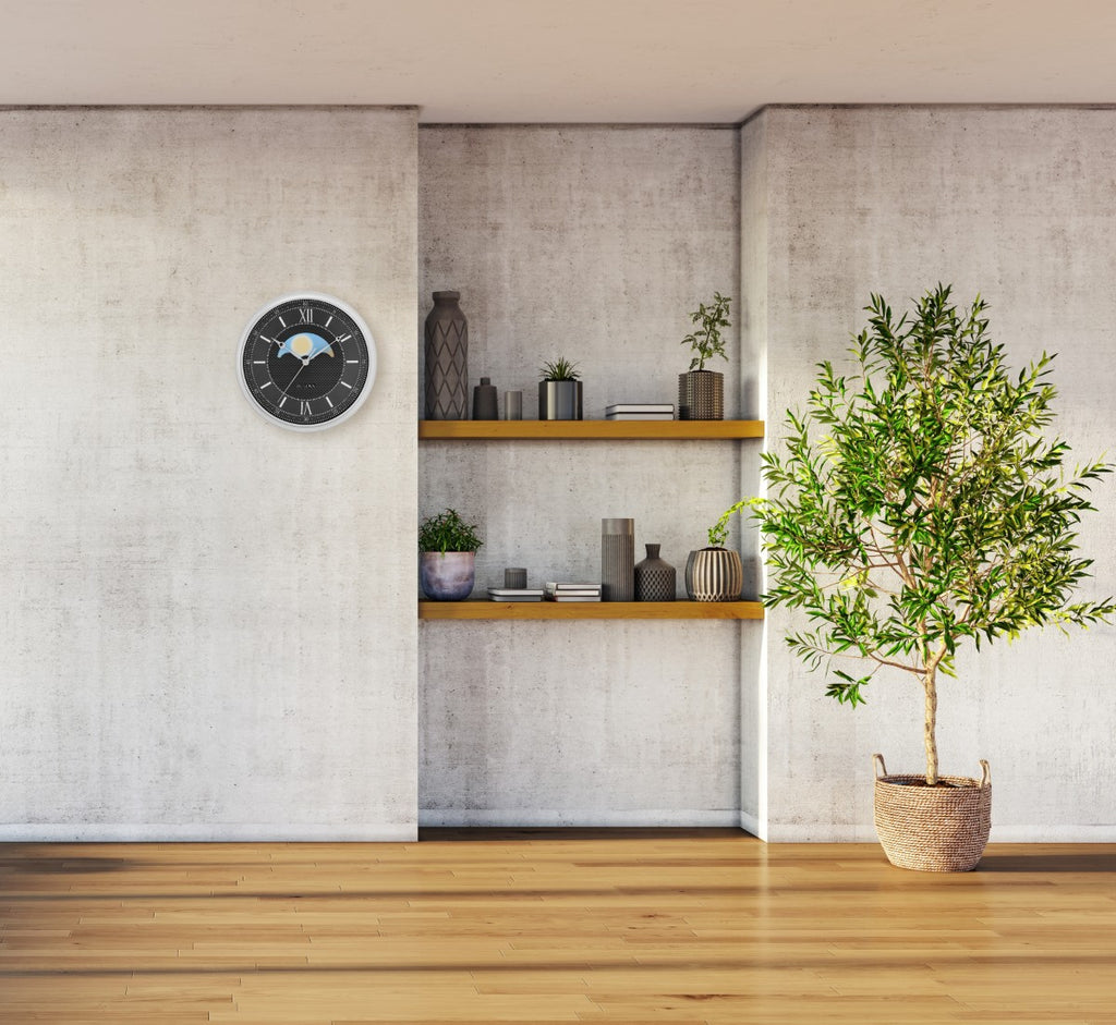 Classic dial design with unique day/night moving center disk, reminiscent of a Grandfather clock’s moon dial. The ebony dial is protected with a convex glass lens and has a “Clous de Paris” type center design found on expensive watches. The polished silver finished raised markers adds an element of depth to the dial. The accurate quartz movement steps off the precise second with each tick. Uses (1) AA battery (not included).