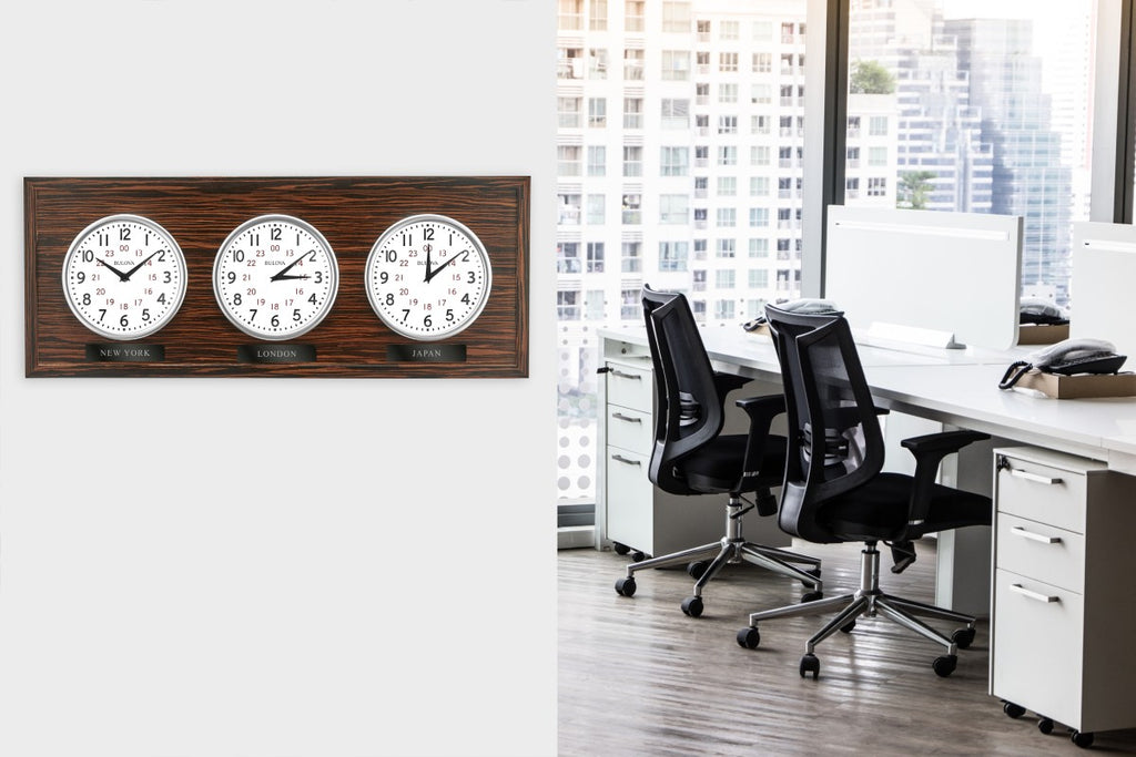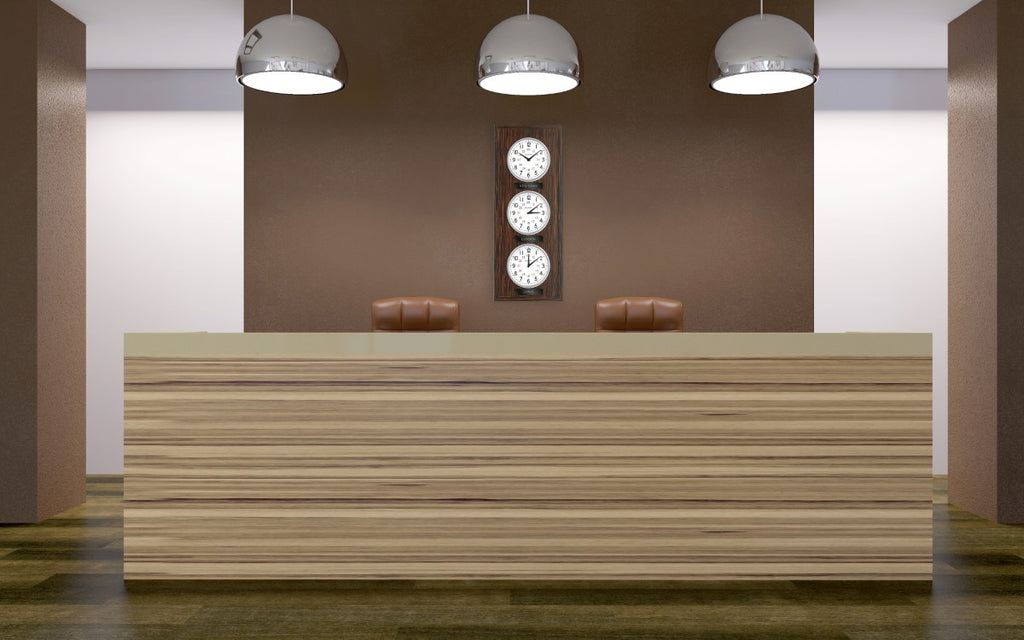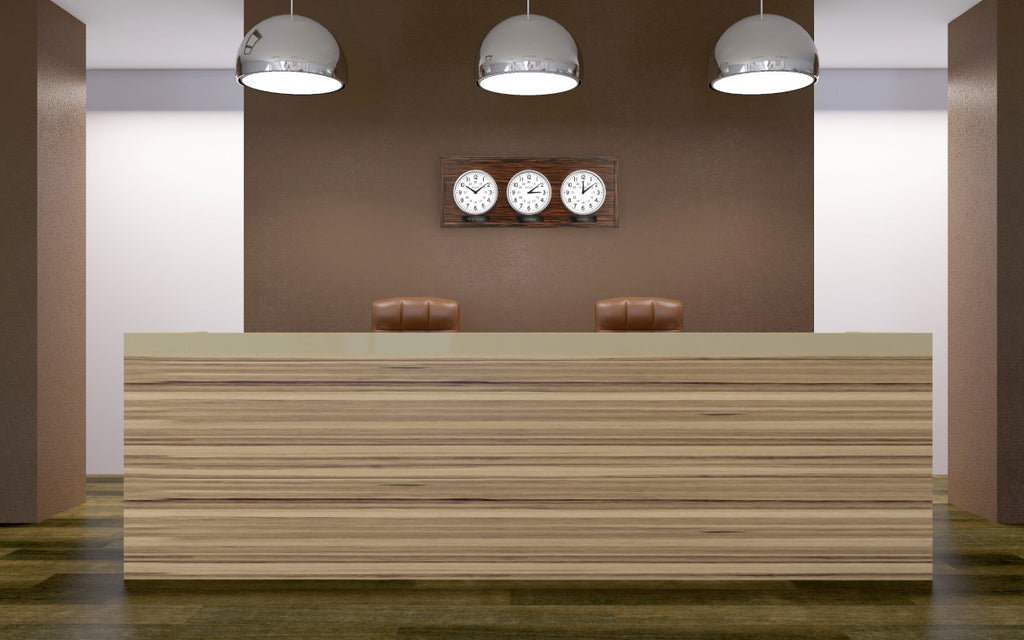 The Reception wall clock features an ebony-finished veneer case that surrounds three white analog dials, each displaying both 12- and 24-hour time formats for easy multi-zone tracking. Clear glass lenses protect each dial, while precise quartz movements provide reliable, accurate timekeeping. Designed for flexible display, this clock can be mounted horizontally or vertically and is ideal for offices, shared spaces, or any setting that requires tracking multiple time zones. Uses (3) AA batteries (not included).
