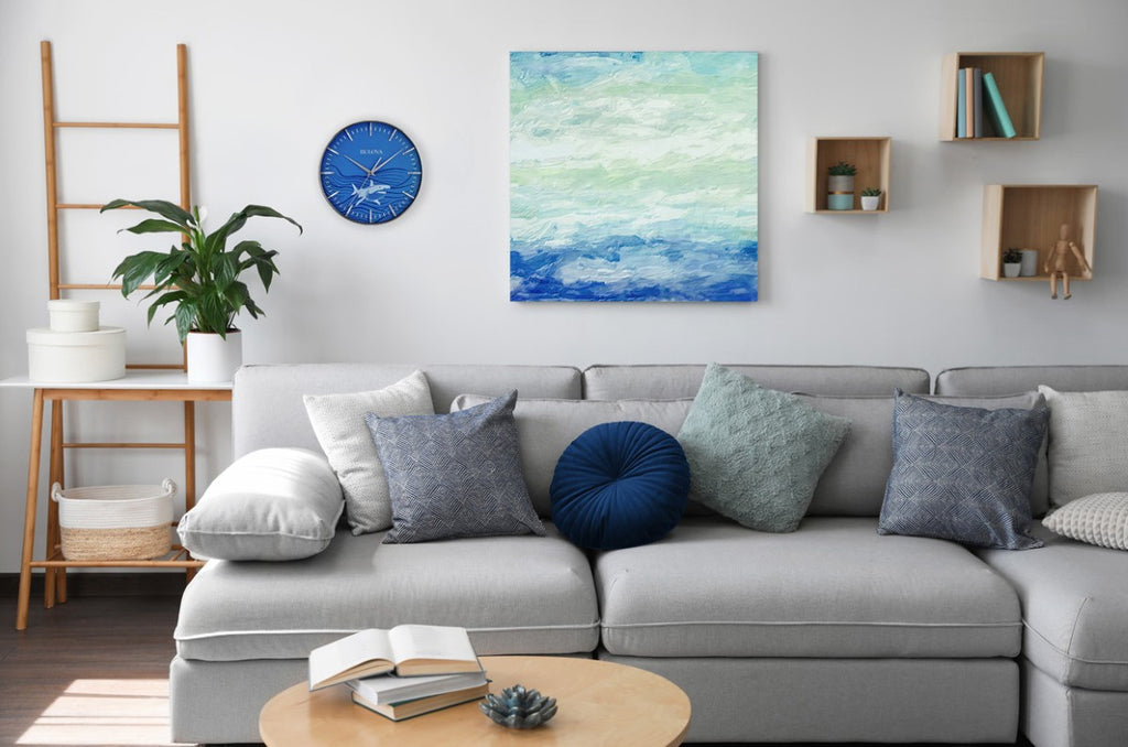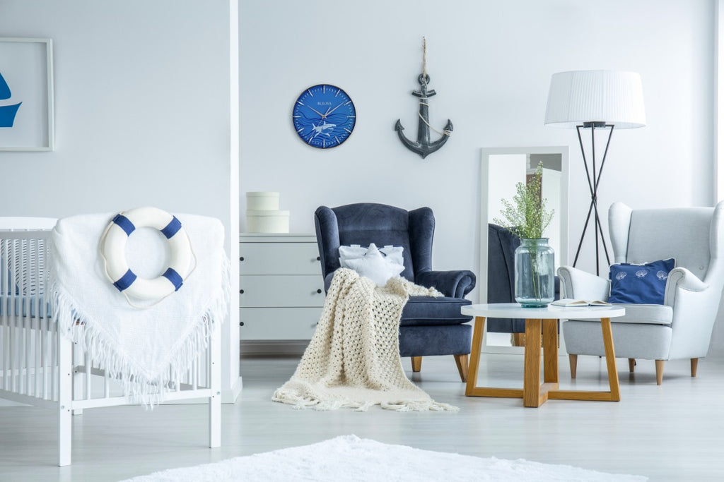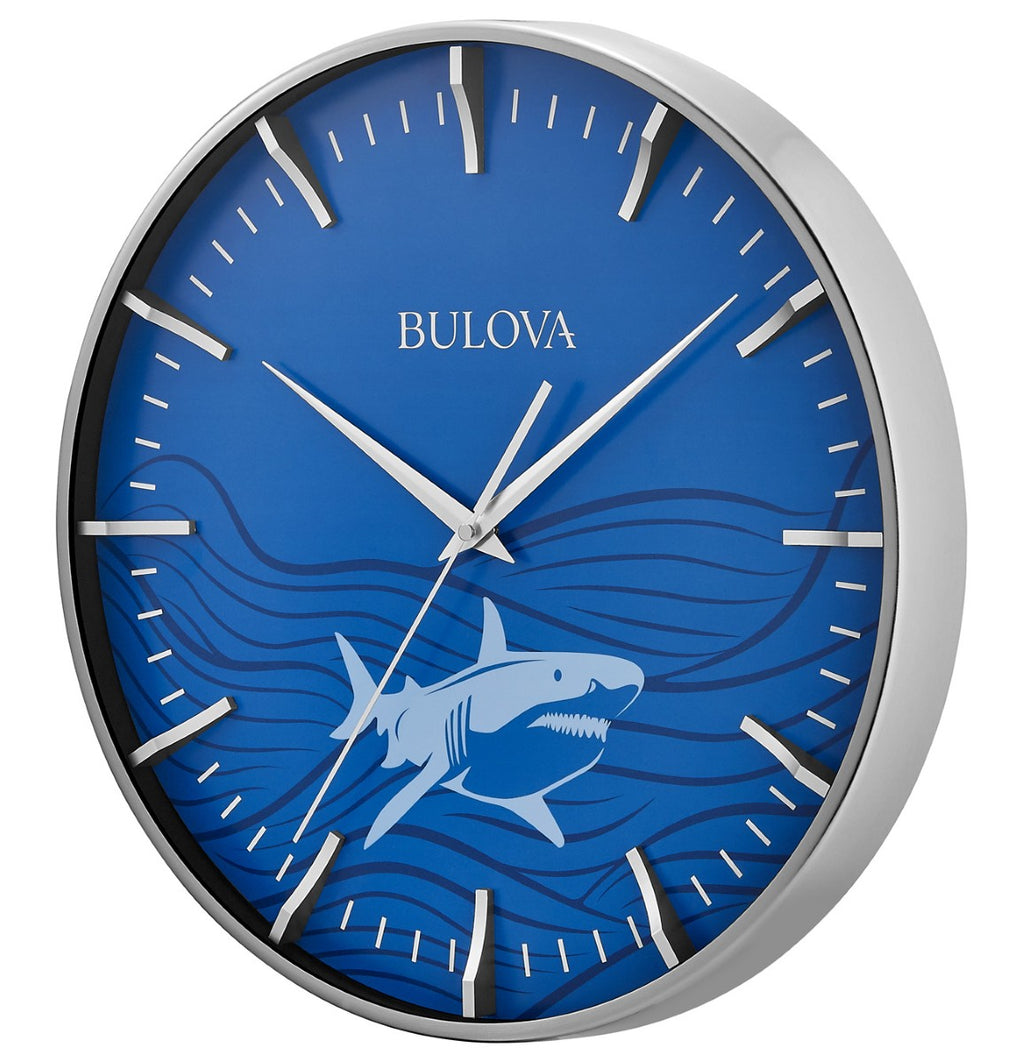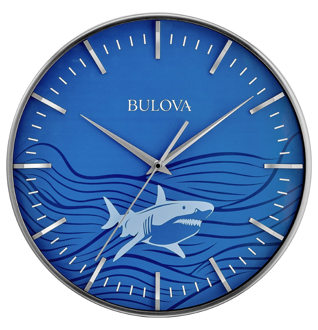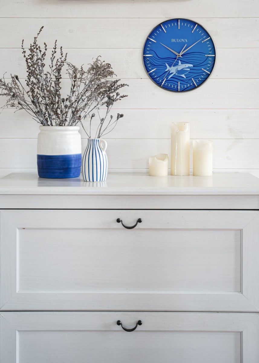 The Great White wall clock features a 16" steel case with a satin nickel finish that surrounds a striking ocean blue dial highlighted by an illustrated Great White shark design. Sculpted hour markers add depth and contrast, while a protective glass lens covers the dial for clarity and durability. Equipped with a silent sweep quartz movement (no ticking) for accurate timekeeping, this clock is ideal for quiet spaces. Uses (1) AA battery (not included).