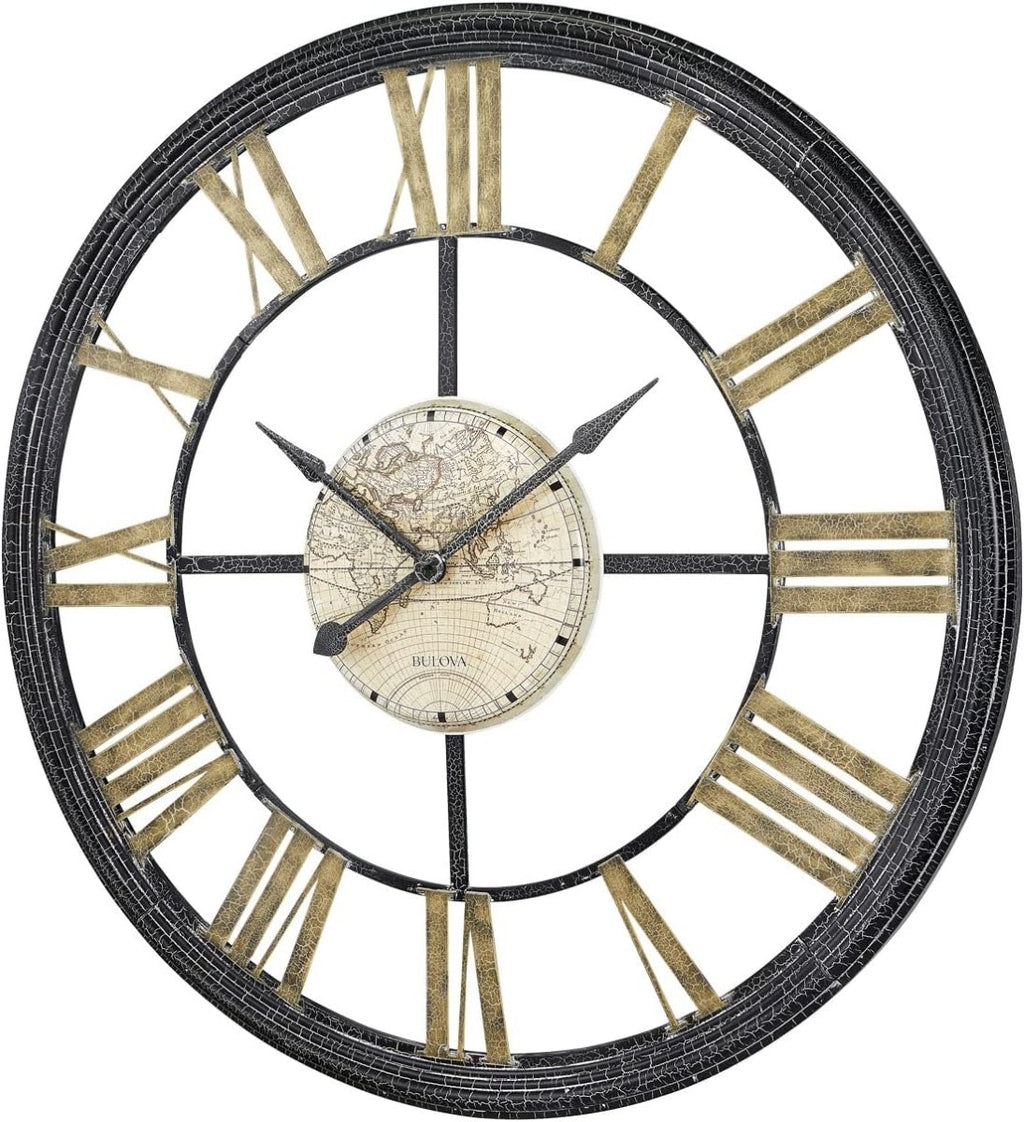 Make a bold statement with this oversized wall clock featuring a dramatic multistep metal frame and vintage-inspired detailing. The crackle-finished frame pairs with gold-tone Roman numerals and a classic world map center dial. The removable center disk allows for easy battery changes without taking the frame off the wall. Designed with a protective cover and suitable for outdoor use. Ships securely in an oversized carton. The accurate quartz movement uses one "AA" battery (not included).