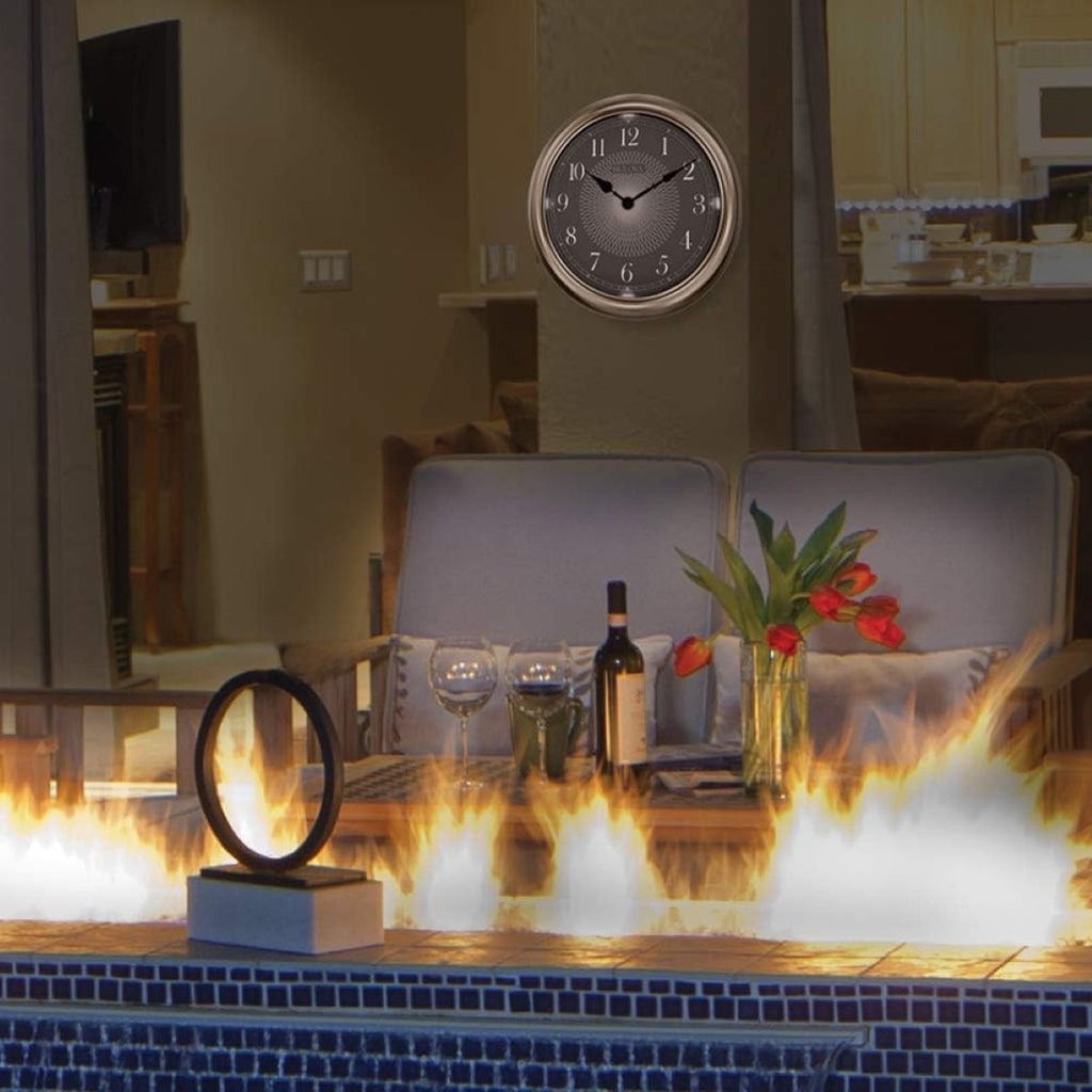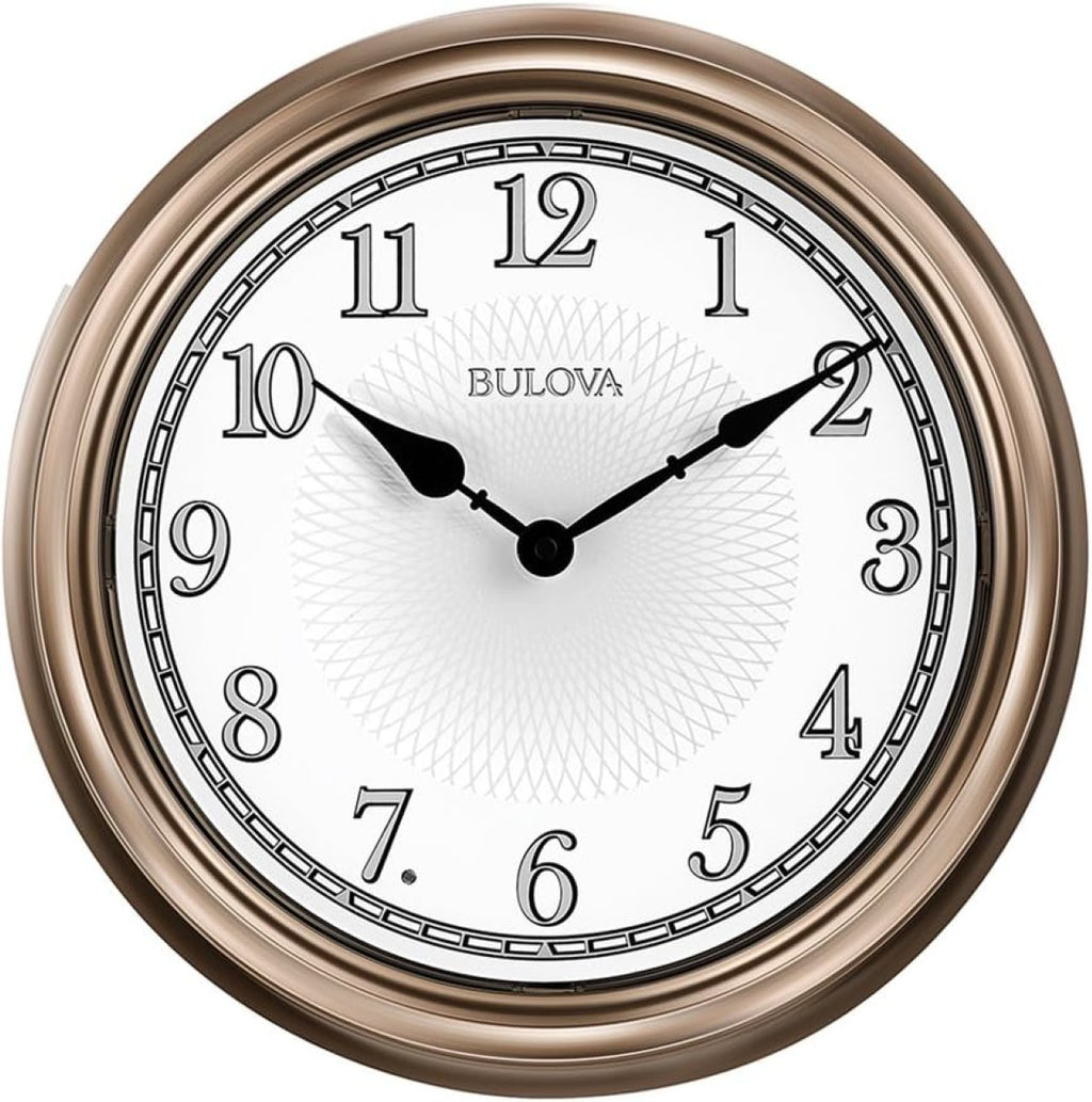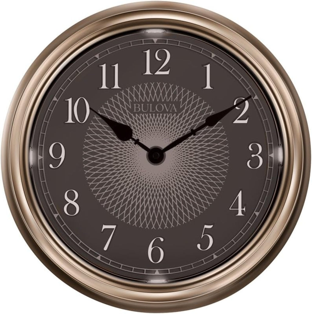The Bulova C4826 Light Time 14" Wall Clock is designed for reliable indoor or outdoor use with a weather-resistant molded case finished in champagne. A bright white dial with bold Arabic numerals ensures easy readability, while responsive lights automatically illuminate the dial from sundown to sunup. New for 2024, Bulova has upgraded the quartz movement to better withstand higher summer temperatures and maintain accurate time in outdoor environments. A sealed dial and protective glass lens help resist moisture and humidity, making this clock ideal for patios, porches, or indoor spaces. Requires (1) AA battery for the clock and (4) D batteries for the lighting feature (not included).