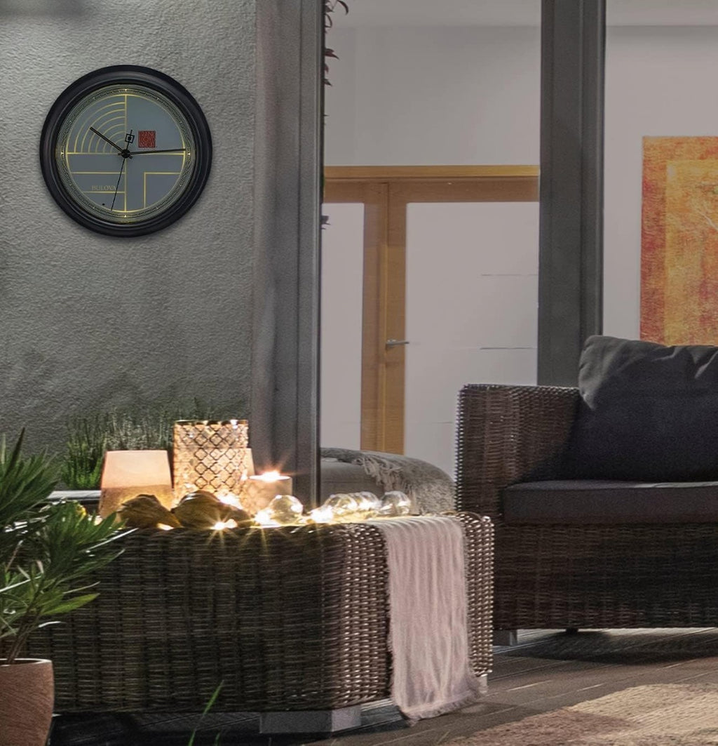 New Frank Lloyd Wright outdoor Lighted dial design, Molded weatherproof case, finished in a rubbed bronze color, Gasketed protective glass lens, Automatic light sensor determines when the 4 white LED’s light up illumination of the reflective ink on the dial. Highlighting the December gifts design from a collection of “Liberty” magazine covers submitted in the 20’s but never published as it was thought they were too Avant guard for the times. Great for any outdoor or high humidity location. Uses 1 AA battery for the silent sweep (no ticking ) quartz movement and (4) D Batteries to power the lights. (not included).